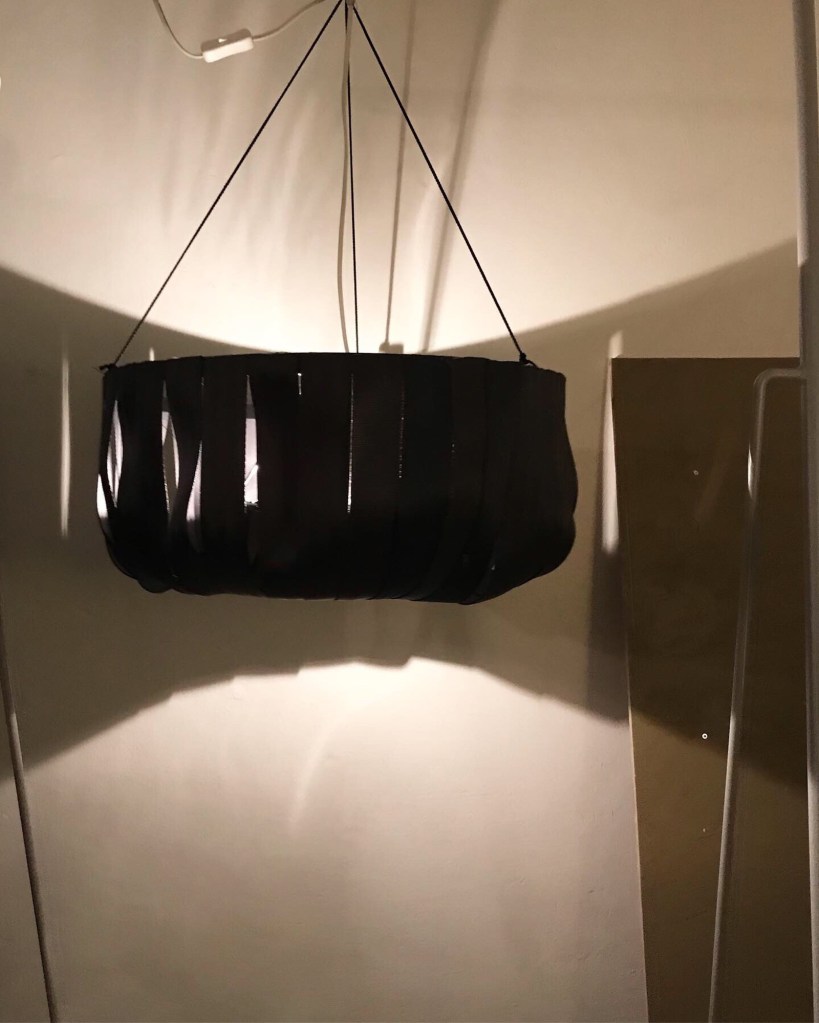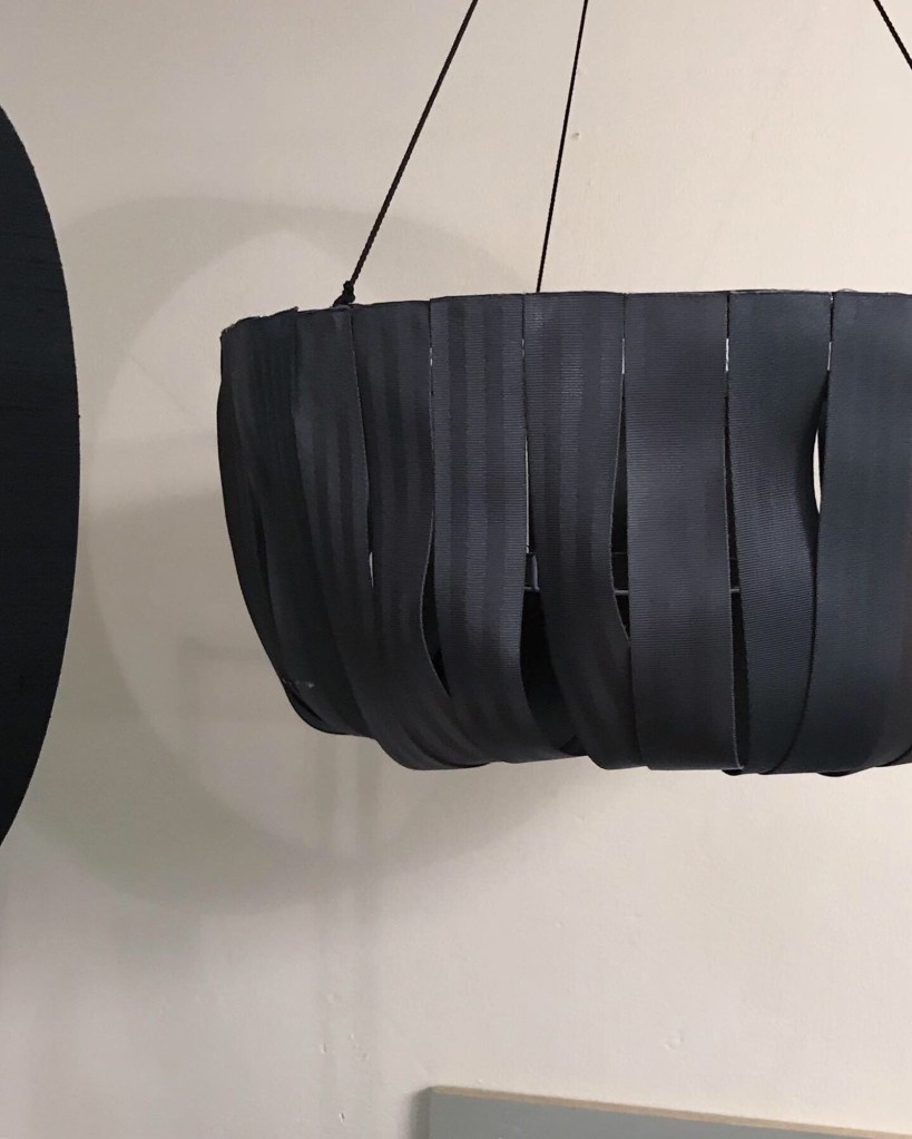 Valaisinprototyyppejä kierrätetystä turvavyöstä. Kokeilin työstää työhuonekumppanini Hanna-Kaisa Haanpään (Hookoohoo Design) käyttämää materiaalia valaisimiksi. / Experimenting with this exclusive material, recycled seatbelt, which my friend Hanna-Kaisa Haanpää uses for her Hookoohoo Design products upstairs in the same Fischer & Berger studio space: my lamp prototypes made of recycled seatbelt.